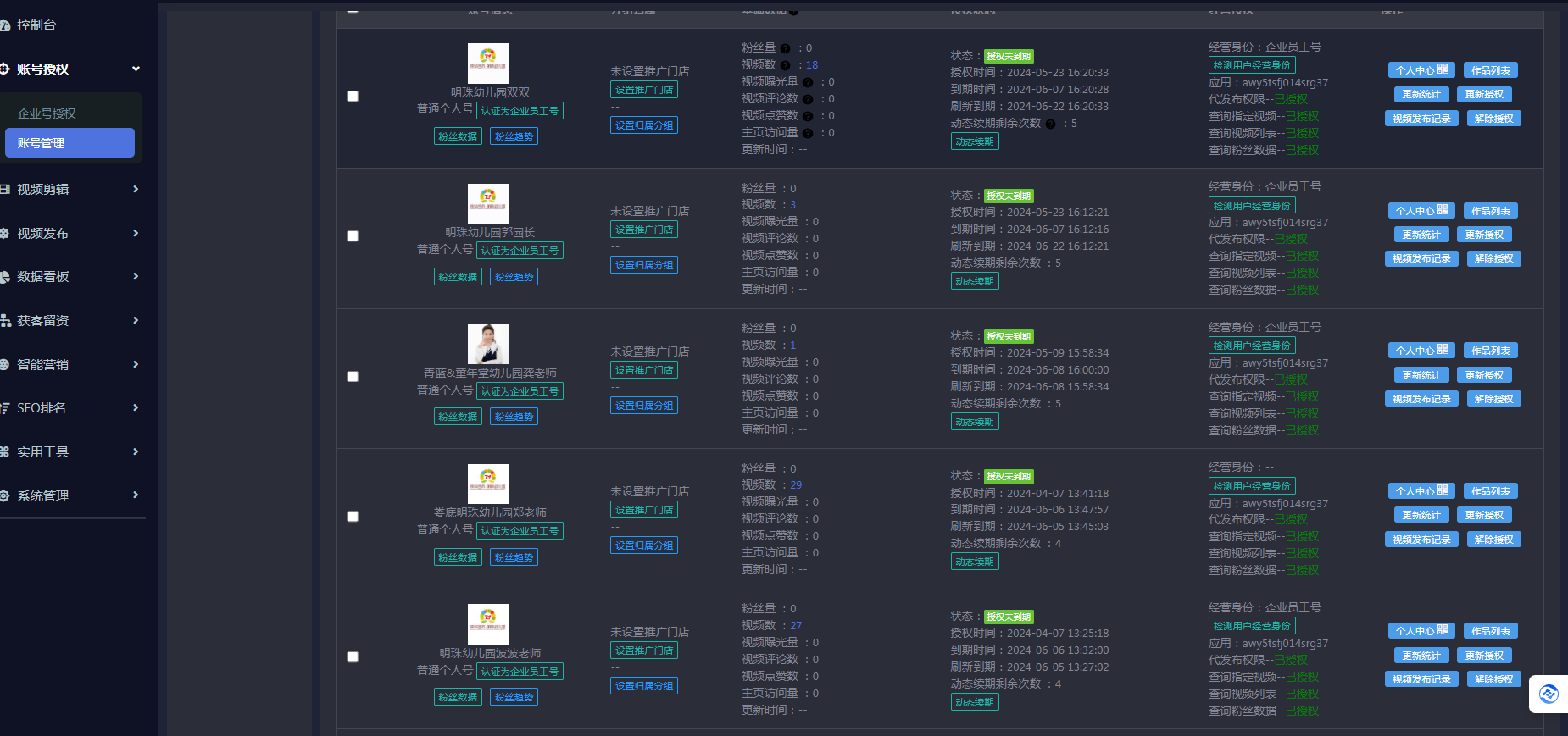 娄底明珠幼儿园就是通过抖去推员工矩阵功能,让员工将抖音账号统一授权绑定至抖去推后台,由专门的运营人员定期进行素材收集,上传,更新,并将批量剪辑好的视频进行定时发布至各个账号上。对员工来说,不需要耗费太多时间和精力就能完成工作要求,此外还能为自己带来业绩。对商家来说,即使一个员工每天的播放量只有300-500之间,但胜在以量取胜,积少成多。20个账号每天的播放量能达到1万+,甚至还会出现爆款视频。